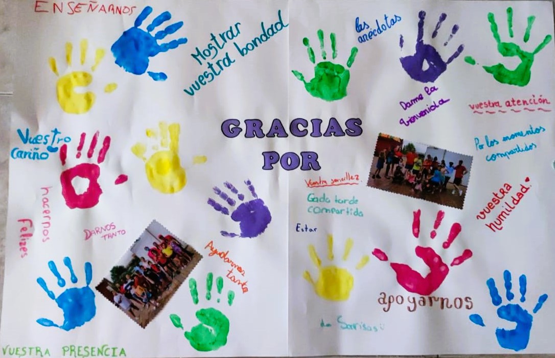 Tras la proyección de un emotivo vídeo en el cual se homenajeaba a todos los hermanos que han sido miembros de la comunidad en estos años, el acto se cerró con una oración conjunta y unas espontáneas palabras de las personas asistentes, entre las cuales destacaron las de Javi el cura agradeciendo la presencia marista durante estos años; las del H. Antonio García, otro fundador del proyecto que recordó la sencillez de los primeros momentos; Ricardo Villafañe, veterano voluntario que agradeció profundamente la oportunidad de haber disfrutado de muchos años apoyando y enseñando su oficio a tantos jóvenes en el Centro de formación de Humanes; y por último Ester Prieto, actual coordinadora del Centro Espiral Lavapiés que, como integrante durante años del equipo de menores del Centro de día para la infancia de Fuenlabrada con otras compañeras como Giovanna Gil y Laura Martín, dedicó sus palabras a recordar divertidas y entrañables anécdotas de los hermanos que pasaron por el centro y que tantos grandes momentos nos regalaron, provocando algunas carcajadas y sonrisas nostálgicas entre los presentes. Además, entregaron a los integrantes de la última comunidad un mural realizado por los niños y niñas del centro que querían tener su particular detalle de despedida con los hermanos que les han acompañado en estos últimos años y de una manera especial a los integrantes de esta última comunidad, los Hermanos Ernesto Tendero, Lorenzo Peñasco y Raúl Rodríguez.